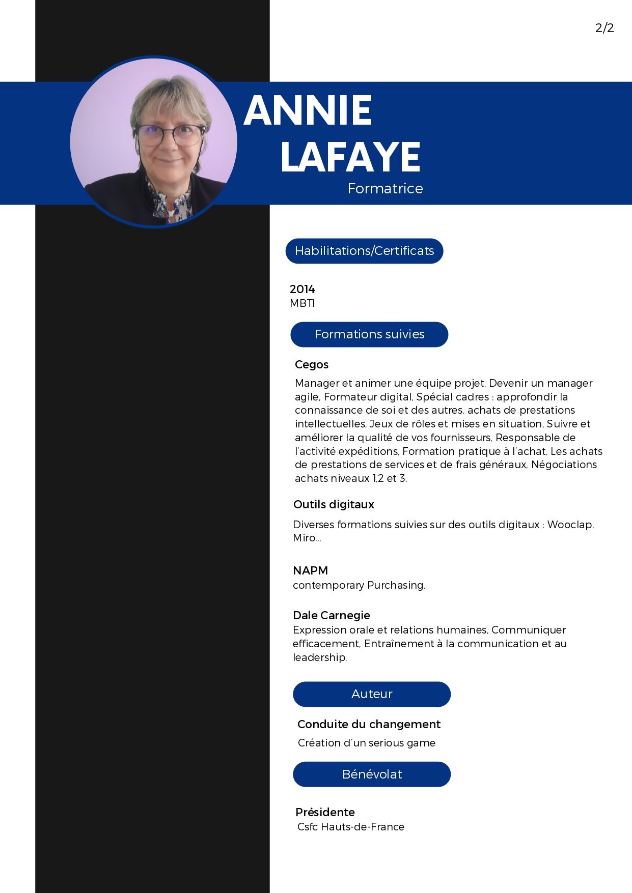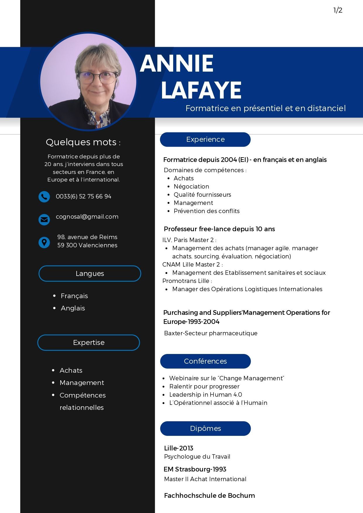 Forte d'une expérience de plus de 20 ans dans la formation, Annie Lafaye évolue aisément dans le milieu des entreprises/organisations aussi bien en France, en Europe qu'à l'international. Elle est prête à relever tous les défis et s'implique à 100 % dans tous les projets qu'elle entreprend.